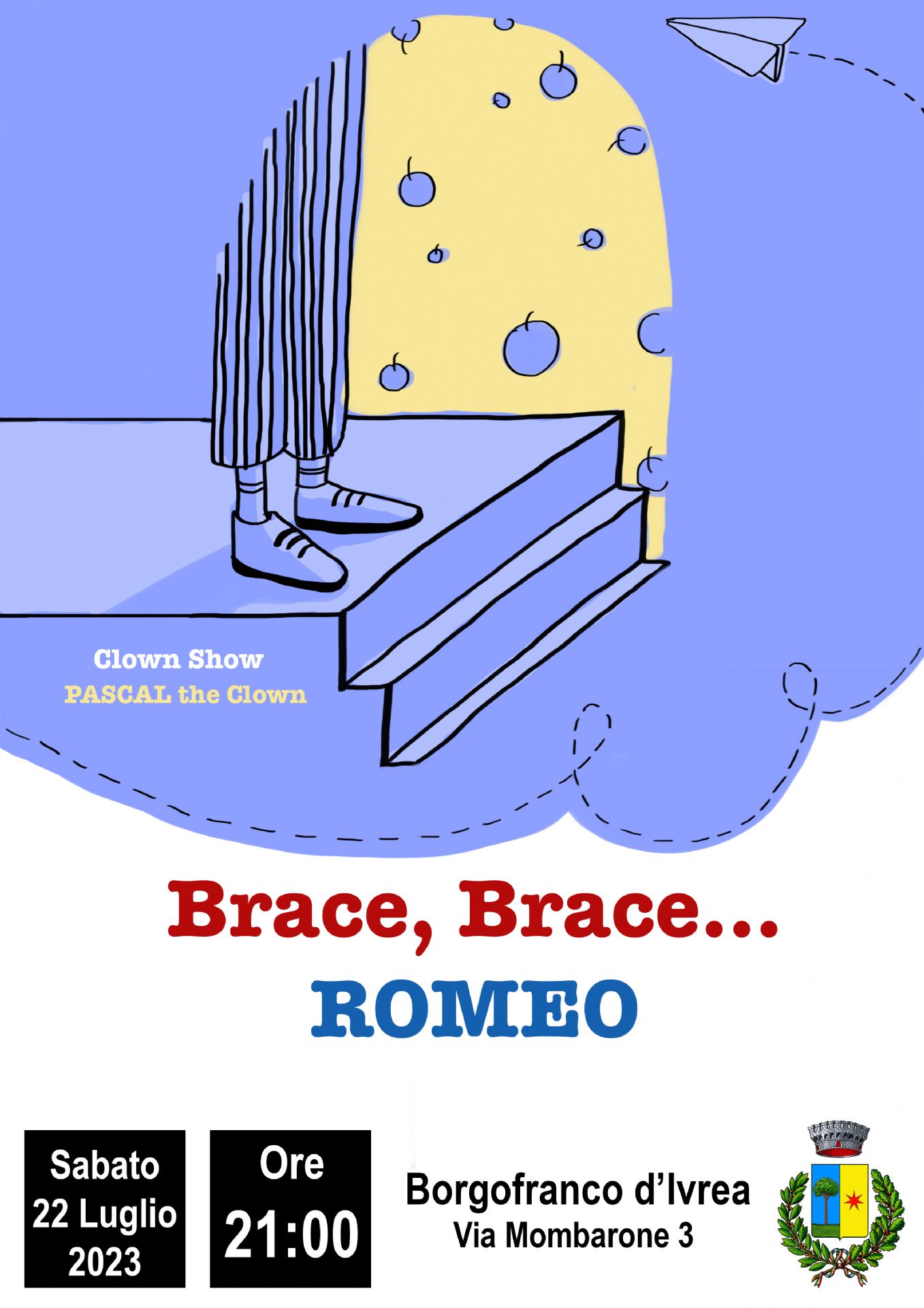 Spettacolo teatrale a cura di "Pascal the Clown" il 22 Luglio 2023 alle ore 21.00 a Borgofranco d'Ivrea in via Mombarone.