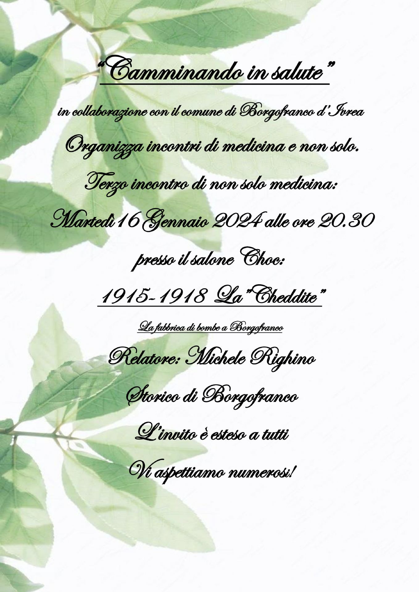 In allegato la locandina dell'incontro dal tema: "Camminando in salute - 1915-1918 La”Cheddite” presso il Salone Choc il 16 Gennaio 2024 ore 20.30.