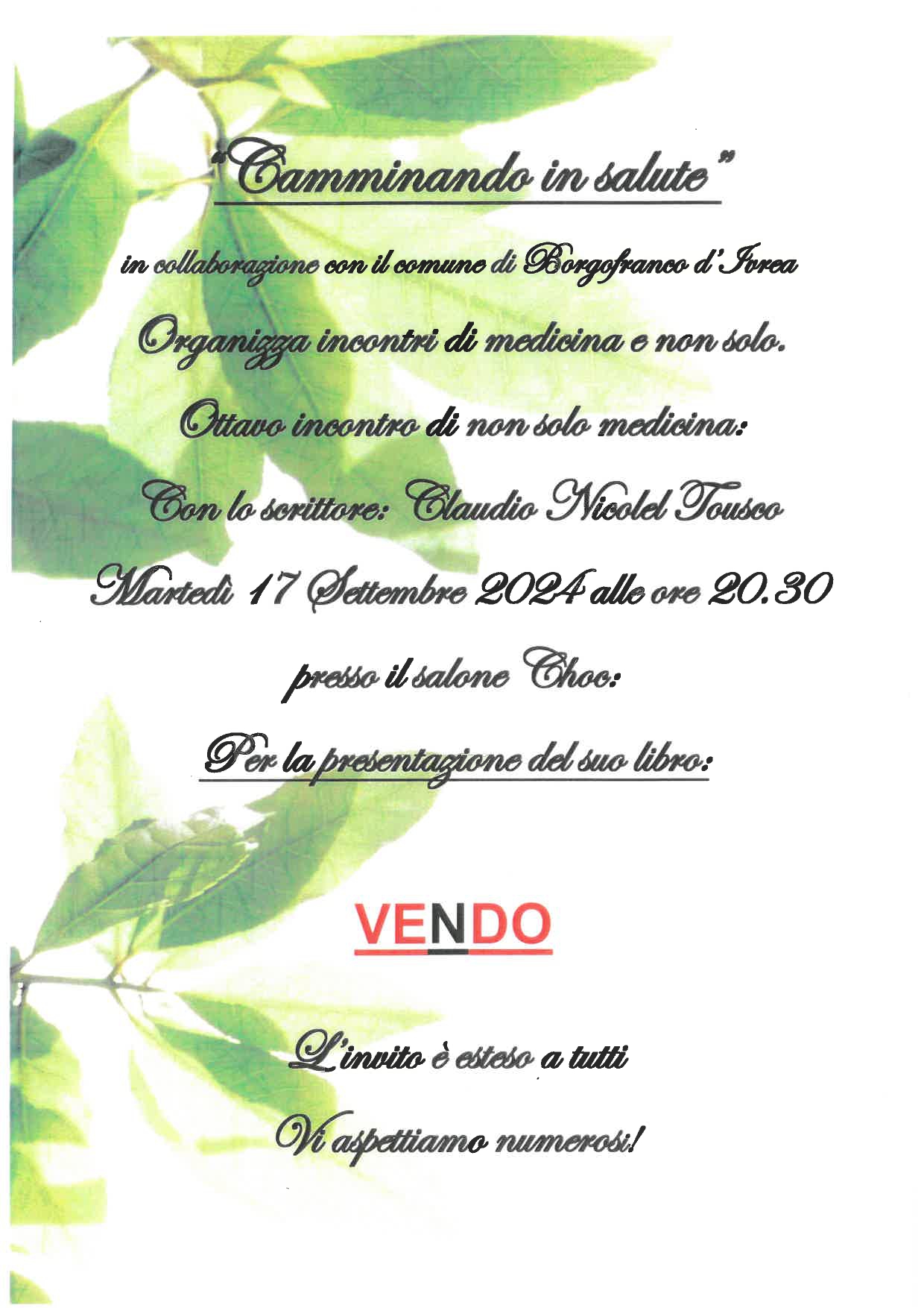 Il gruppo "Camminando in salute" organizza la presentazione del libro "VENDO" di Claudio Nicolel Tousco il 17 Settembre alle ore 20.30 presso il salone Choc di Borgofranco d'Ivrea.