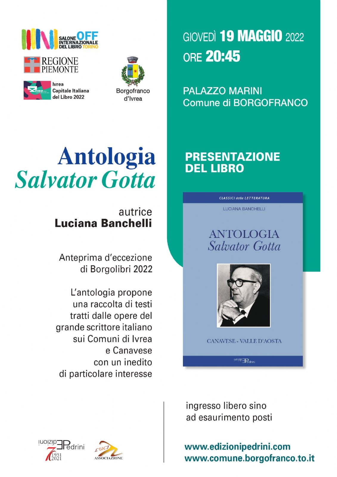 Anteprima d’eccezione di Borgolibri 2022 a Palazzo Marini con la presentazione del libro "Antologia di Salvator Gotta", dell'autrice canavesana Luciana Banchelli. L'antologia propone una raccolta di testi tratti dalle opere del grande scrittore italiano sui Comuni di Ivrea e del Canavese, ai quali si è aggiunto un inedito di grande interesse. L'evento si terrà giovedì 19 maggio alle ore 20.45 presso Palazzo Marini. Ingresso libero fino ad esaurimento posti.