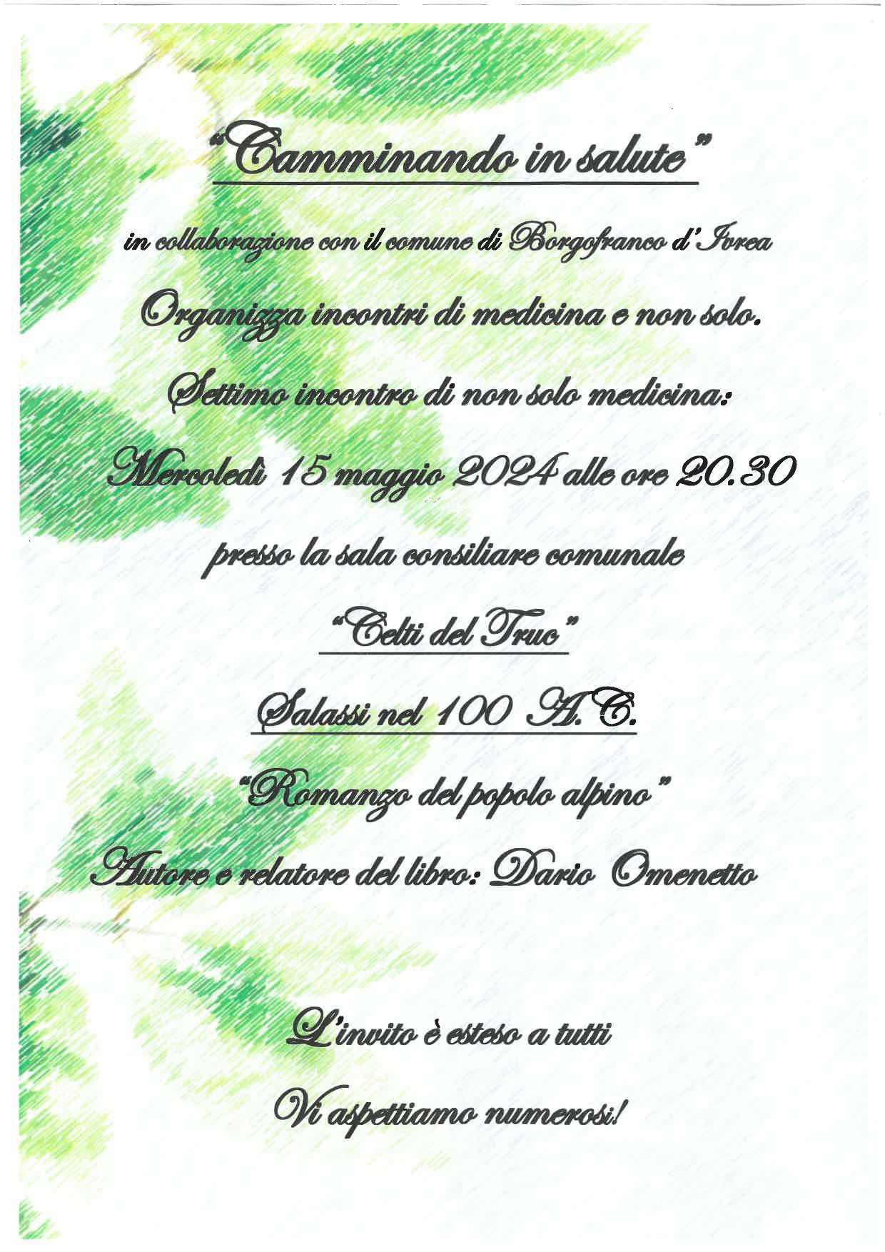 In allegato la locandina dell'incontro del ciclo "Camminando in salute" del 15 Maggio 2024 che si terrà presso la sala Consiliare del Comune di Borgofranco. L'invito è aperto a tutti.