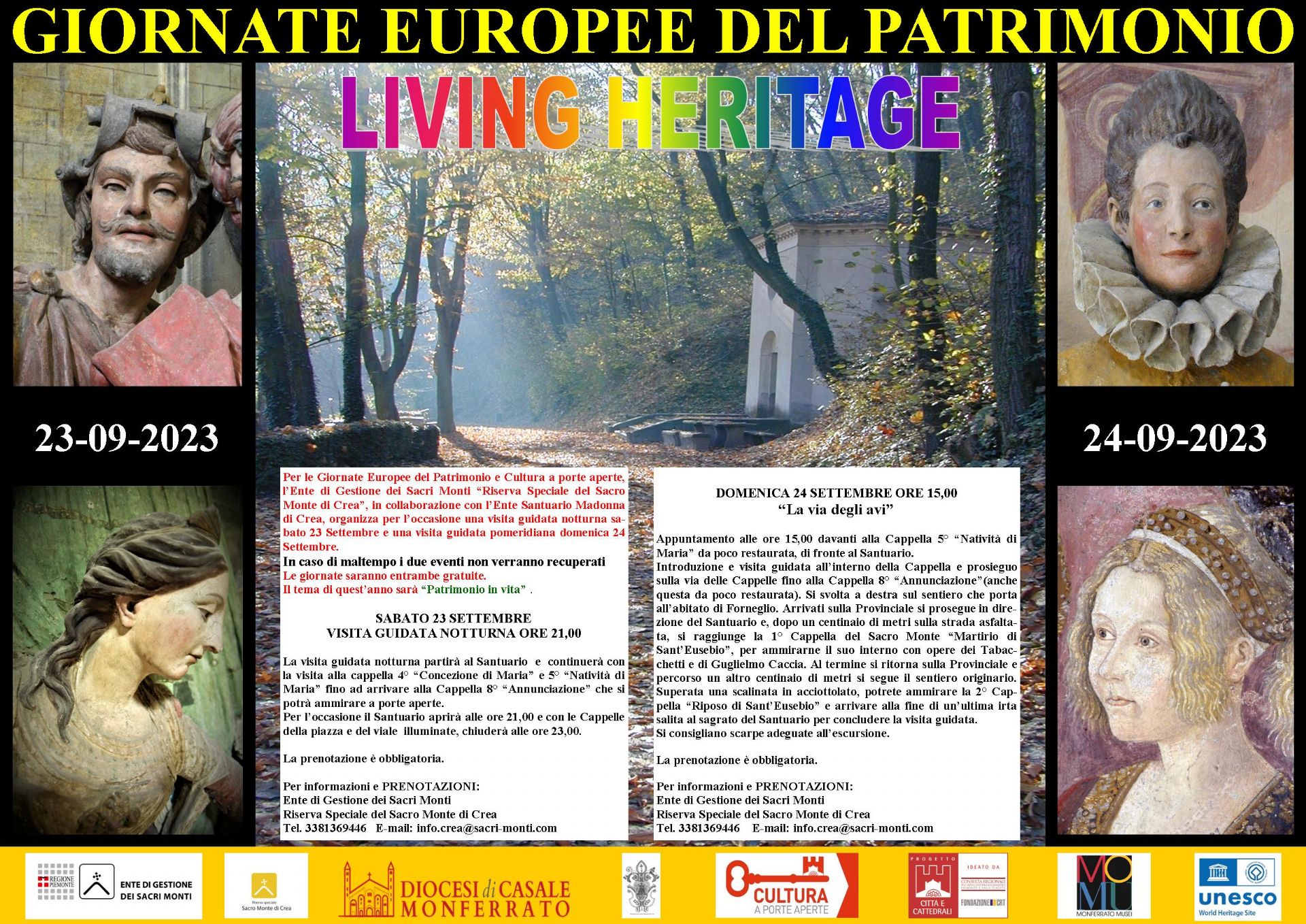 Per le Giornate Europee del Patrimonio e Cultura a porte aperte, l’Ente di Gestione dei Sacri Monti “Riserva Speciale del Sacro Monte di Crea”, in collaborazione con l’Ente Santuario Madonna di Crea, organizza per l’occasione una visita guidata notturna sabato 23 Settembre e una visita guidata pomeridiana domenica 24 Settembre.