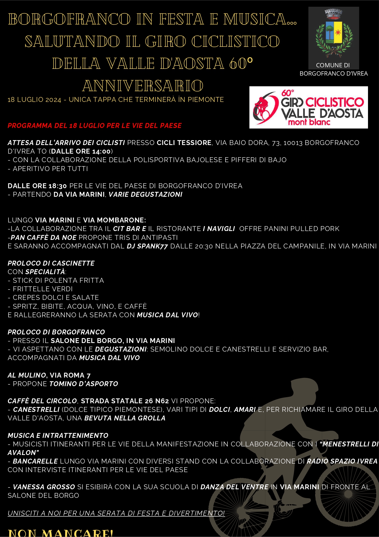 In occasione del passaggio del Giro Ciclistico della Valle d'Aosta il 18 Luglio 2024 per cui Borgofranco d'Ivrea sarà tappa di arrivo (tappa Verres-Borgofranco d'Ivrea), si trasmette locandina dell'evento.
