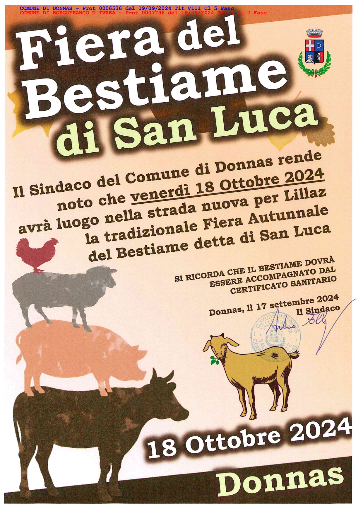 Per conoscenza si trasmette la locandina della Fiera del Bestiame di San Luca di Donnas.