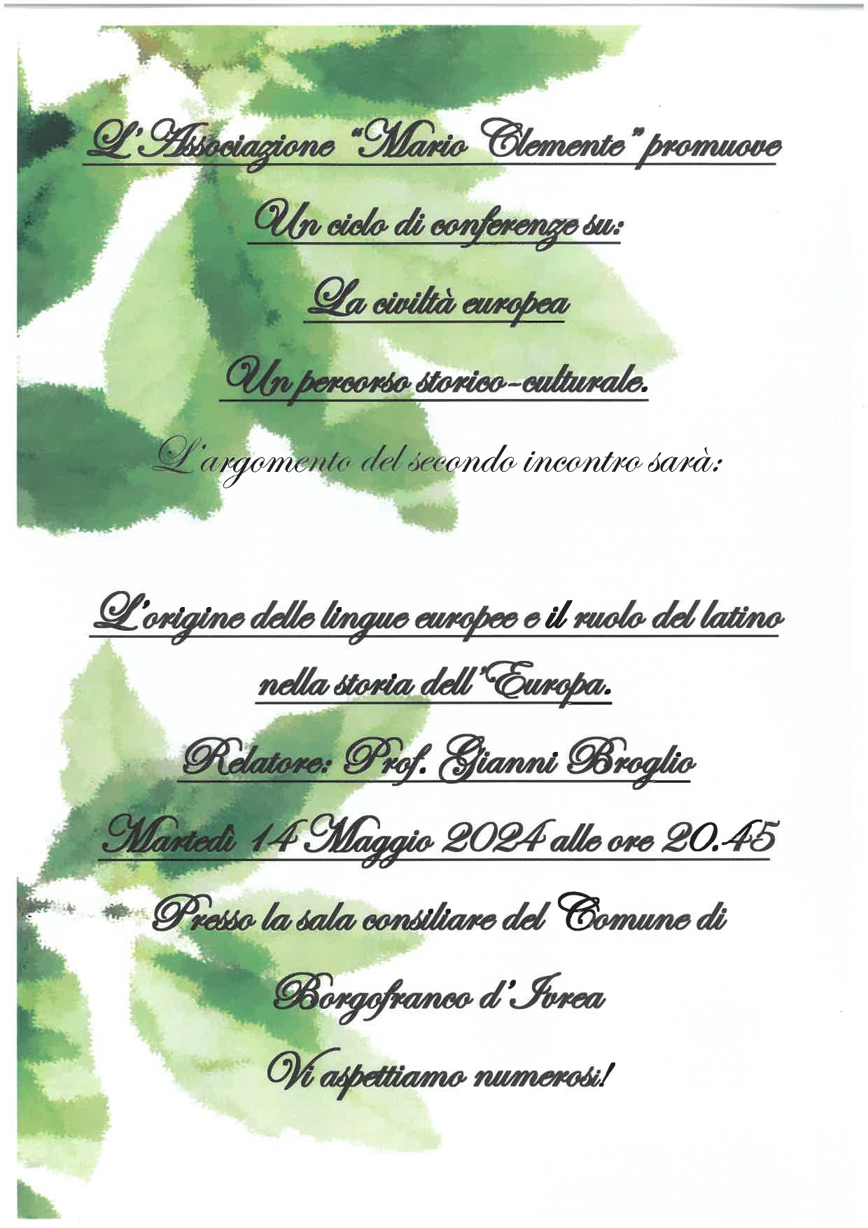 In allegato la locandina della conferenza in oggetto che si terrà con la collaborazione dell'"Associazione Mario Clemente" il 14 Maggio presso la sala Consiliare del Comune di Borgofranco d'Ivrea. L'invito è aperto a tutti.