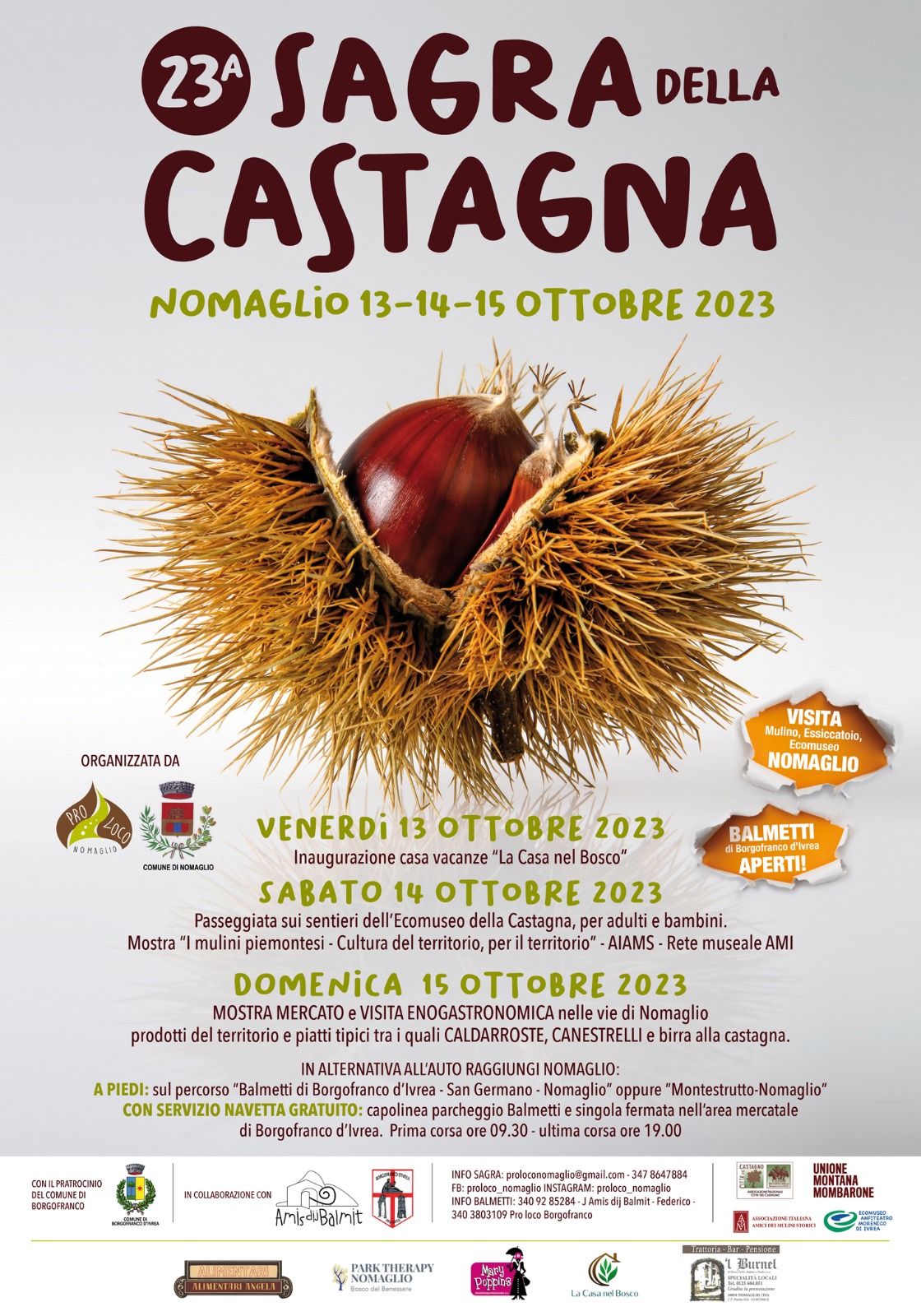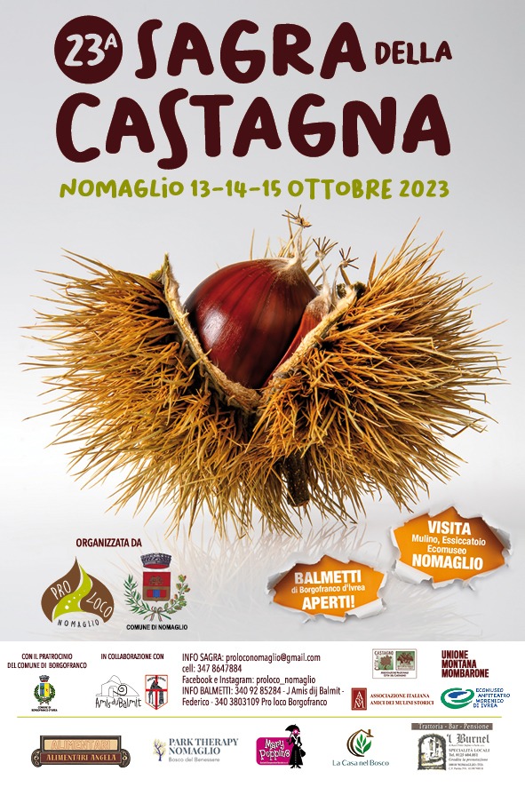 Il 13-14 e 15 Ottobre a Nomaglio si svolgerà la caratteristica "Fiera della Castagna" con il Patrocinio del Comune di Borgofranco d'Ivrea. In allegato la locandina con il programma