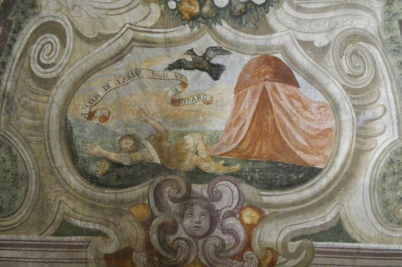 Sulla volta dello scalone è dipinto, tra cielo e terra, il mito di Proserpina: in basso è il pianto di Demetra; in alto, tra nubi infuocate, tra amorini con trecce e ghirlande di fiori corre, trainato da due cavalli bianchi, il carro di Plutone che stringe l'amata tra le braccia.