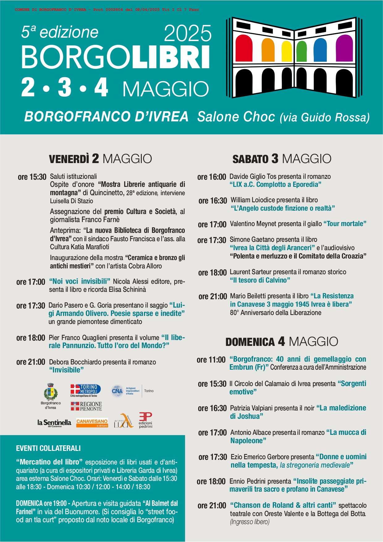 da Venerdi 2 Maggio a Domenica 4 Maggio si svolgerà a Borgofranco d'Ivrea la 5° Edizione del festival letterario "Borgolibri" con il patrocinio del Comune.