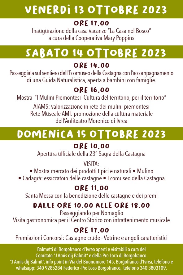 Il 13-14 e 15 Ottobre a Nomaglio si svolgerà la caratteristica "Fiera della Castagna" con il Patrocinio del Comune di Borgofranco d'Ivrea. In allegato la locandina con il programma