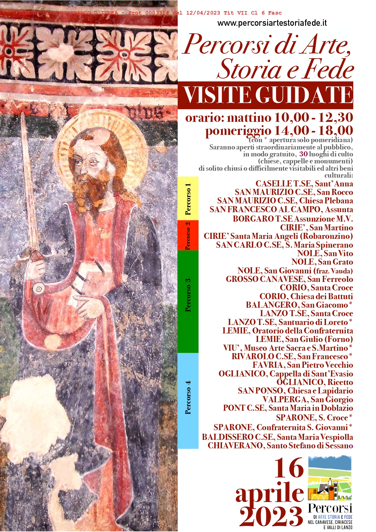 In allegato la locandina con i percorsi e gli orari delle visite guidate ai luoghi di culto sparsi per il Canavese che saranno aperti e visitabili gratuitamente il 16 Aprile 2023.