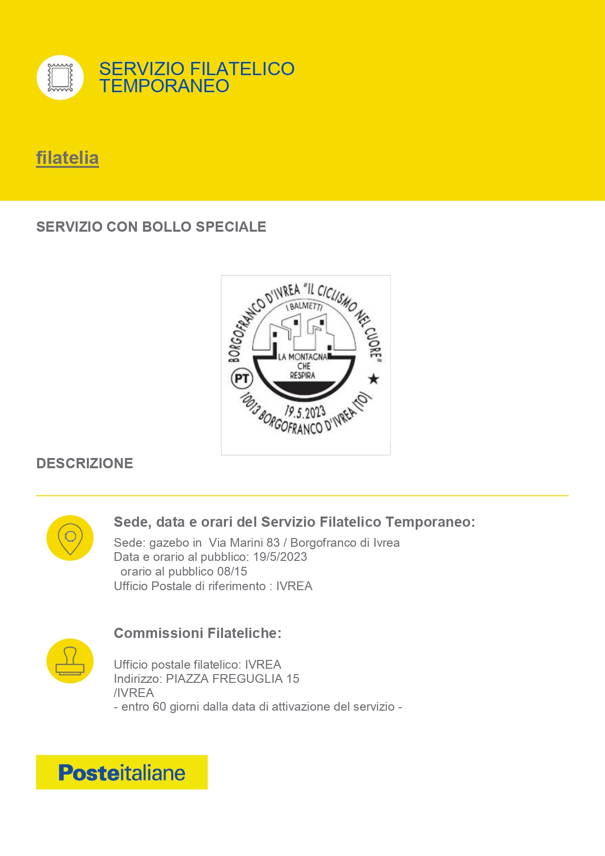 In occasione del passaggio da Borgofranco d'Ivrea della 13° Tappa del Giro d'Italia è stato emesso un annullo filatelico Temporaneo. Per chi fosse interessato di seguito i riferiemnti di dove trovarlo e la locandina in allegato.