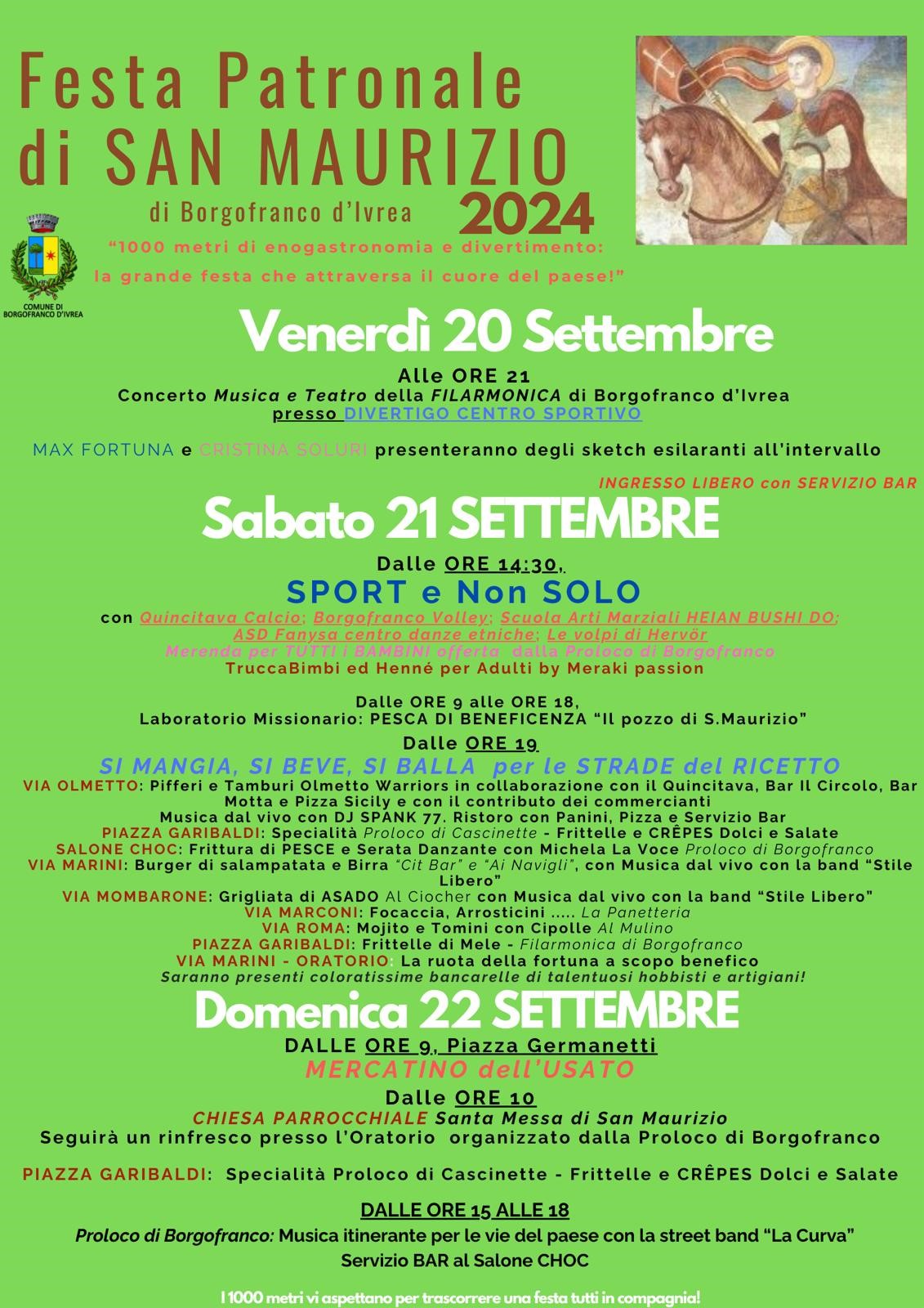 In allegato la locandina della Festa Patronale di san Maurizio 2024 che si terrà a Borgofranco d'Ivrea dal 20 al 22 Settembre 2024.