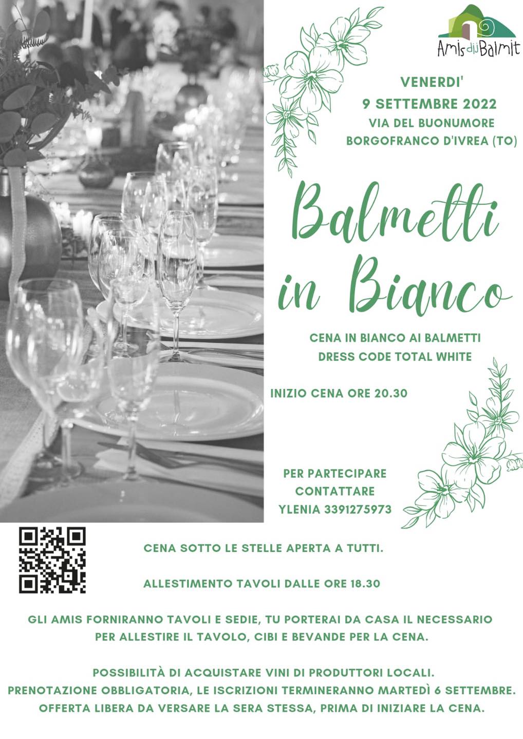 CENA IN BIANCO AI BALMETTI-Venerdi 9 Settembre. Tutti i dettagli sono nella locandina allegata oppure contattando gli Amis dij Balmit.