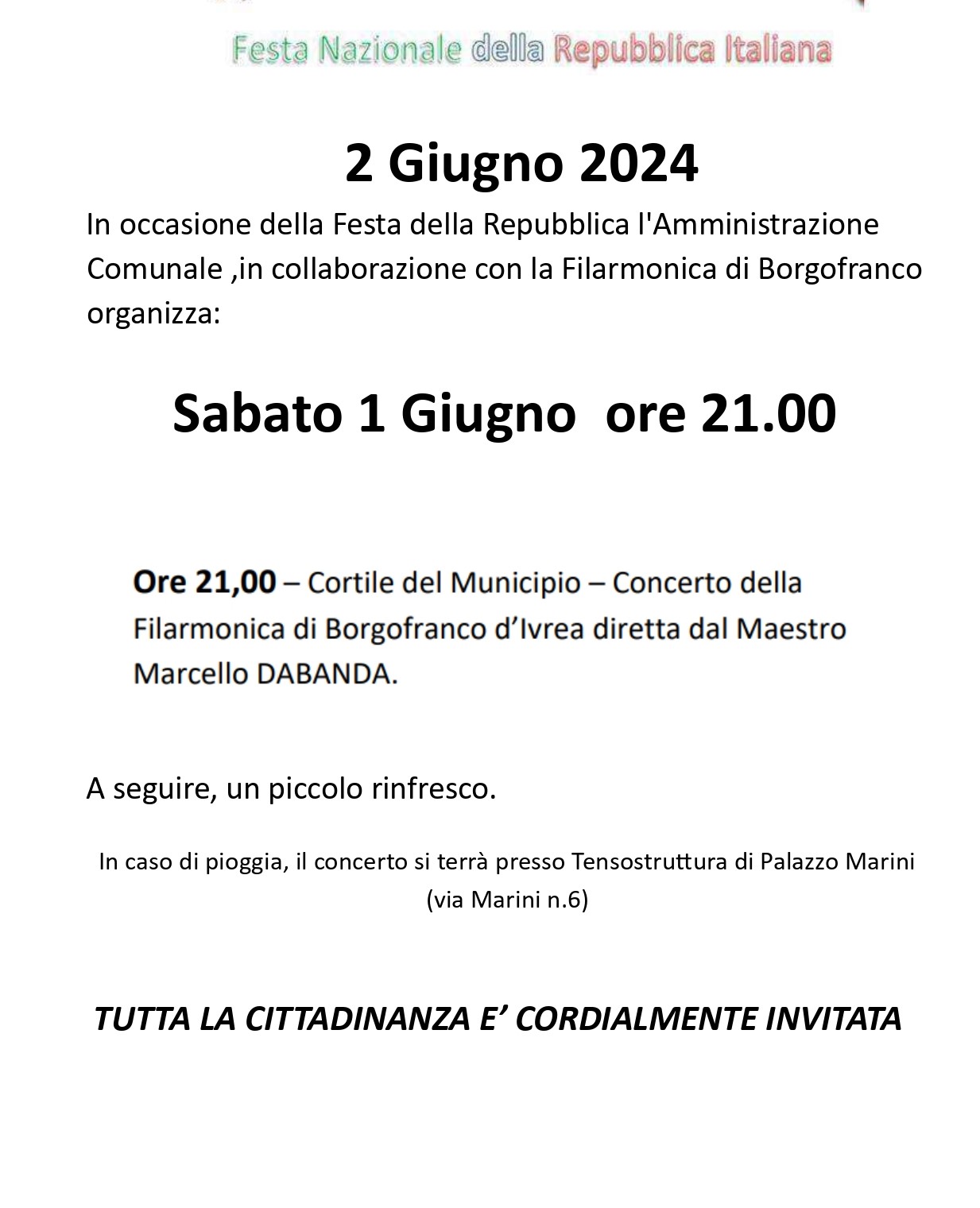 Sabato 1 Giugno alle ore 21.00 si terrà il concerto della Filarmonica di Borgofranco d'Ivrea nel Cortile del Municipio in occasione della Festa della Repubblica.